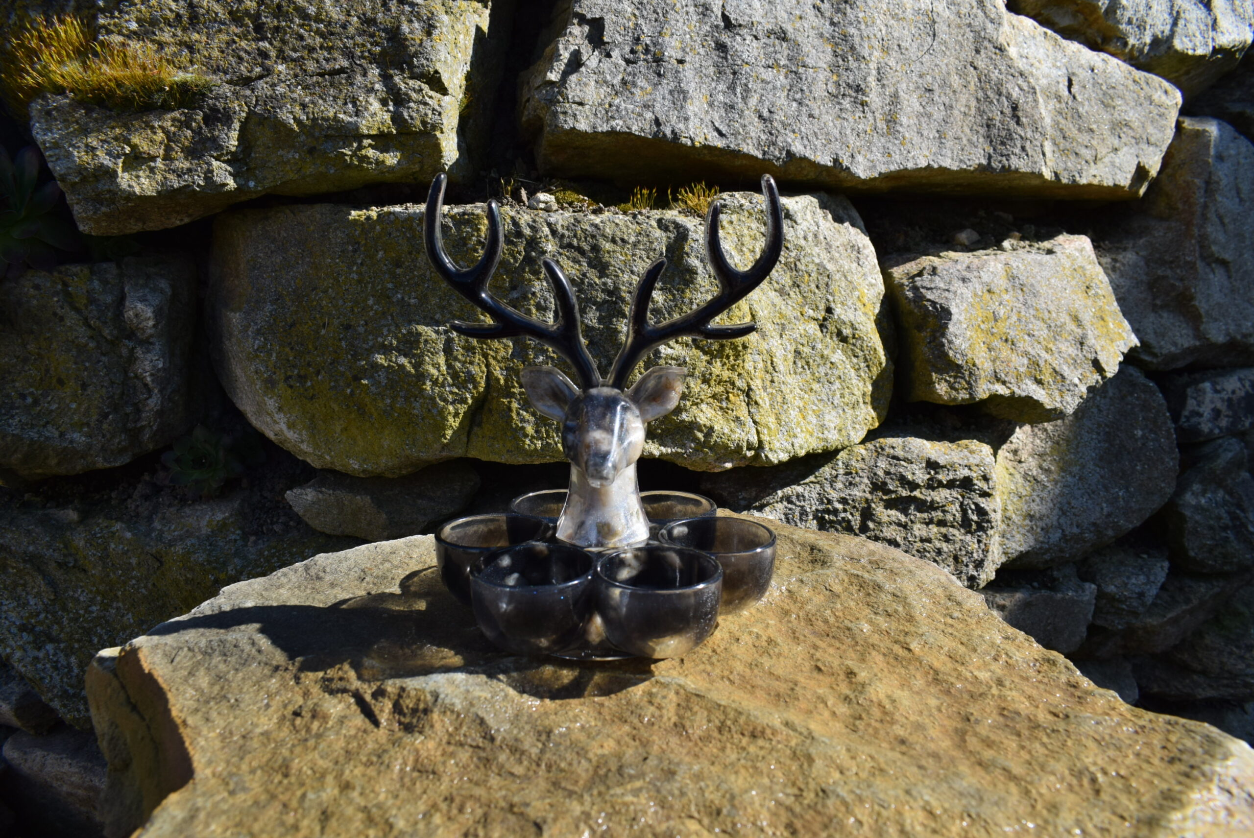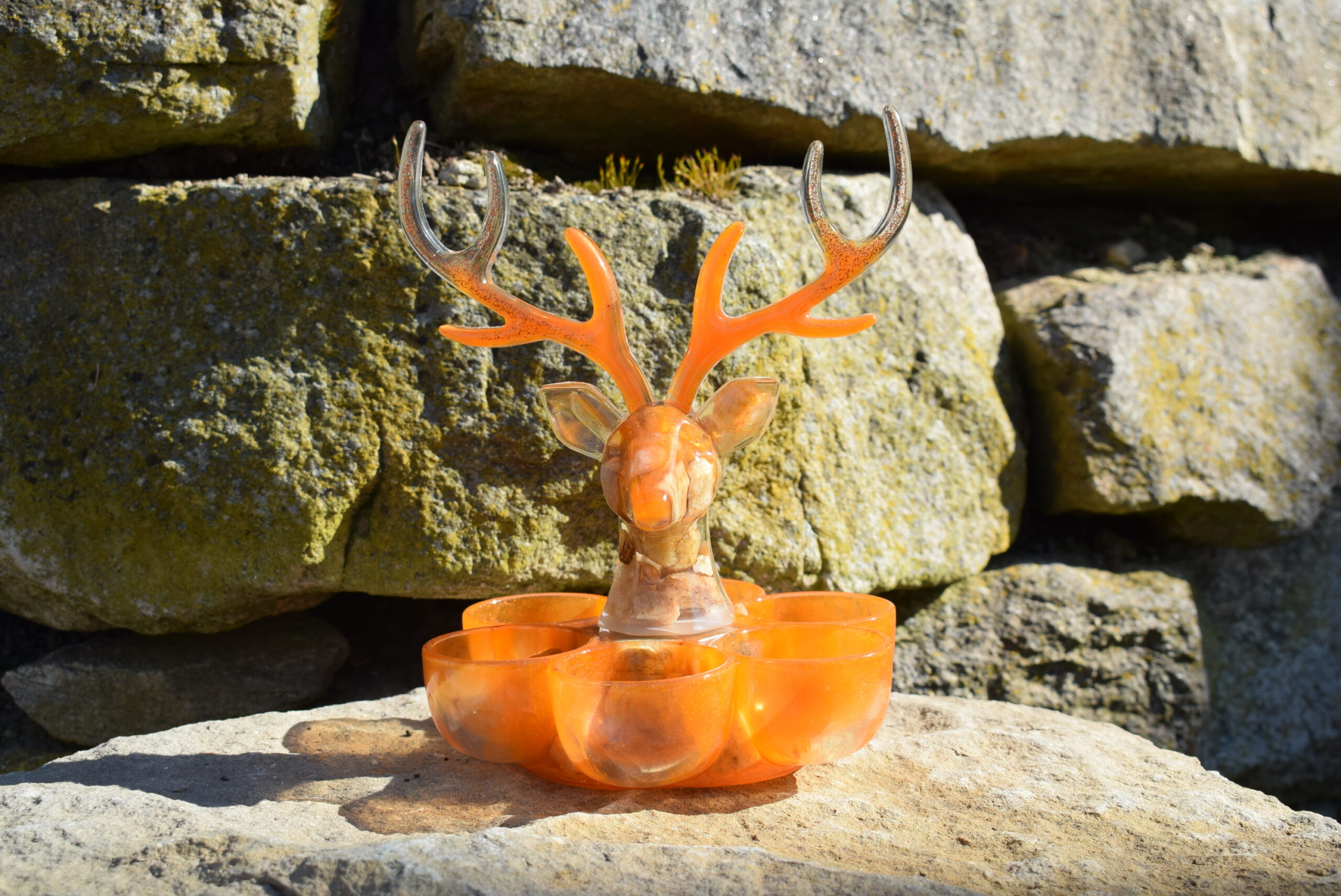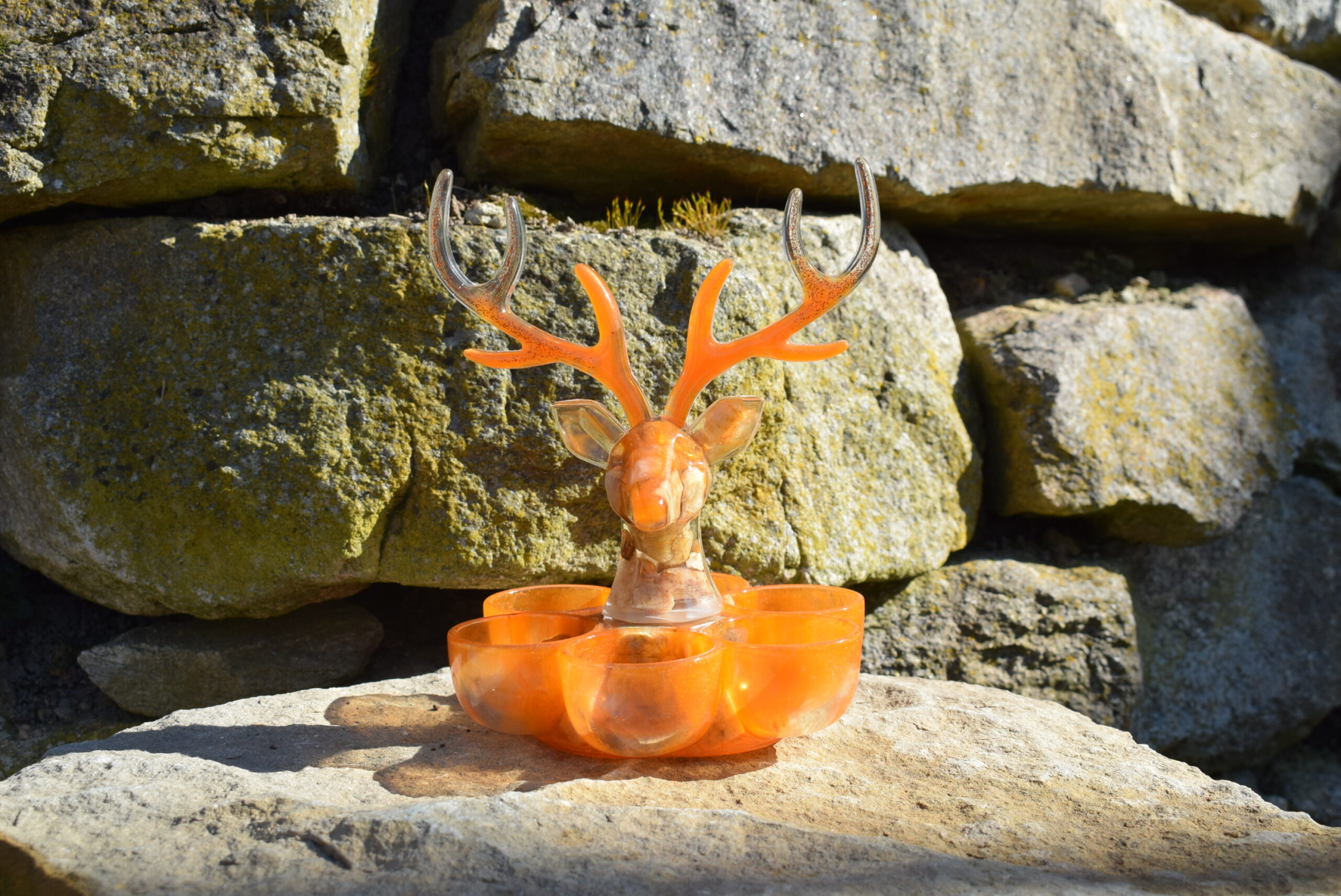 Použité materiály: epoxidová pryskyřice certifikovaná pro styk s potravinami, práškové barvivo, třpytky, kamenivo